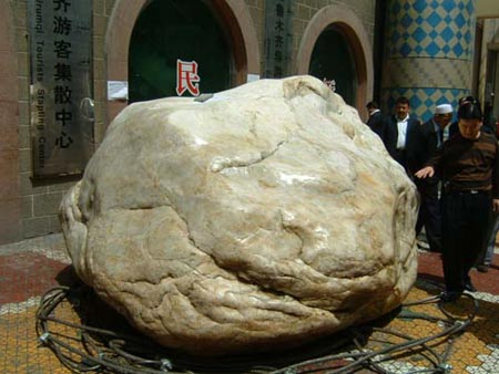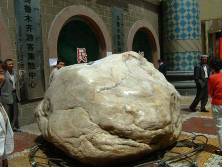 25日,记者来到来到新疆民街,,远远的记者就看见在民街门前放着看到一块乳白色的巨石。记者来到跟前发现,石头约2米高,宽约5米,摸起来很光滑,少数部位呈现出土黄和红色。围观群众的人很多,吴志国和于保就远远的蹲在台阶上看着人群和他们的石头。记者走近细看,石头高约2米,宽约5米,摸起来很光滑,有的地方呈土黄色或红色。吴志国告诉记者:“来看和看石头询问的人很多,但没有一个是要真心买的。”吴志国告诉记者。