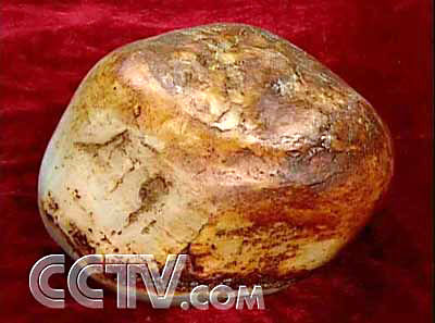 专家评述:这是一块和田白玉,很大的一个子料。这个子料,它这个重量一般都是几克,几十克占大多数的,几公斤就非常罕见了,所以这个呢有二十公斤那就是非常罕见的,非常罕见。这块玉呢,白度也还不错,光泽有一定的油脂光泽,结构也比较细腻,特别是它有很好的一个枣红皮子,这一点对子料来讲呢是非常好的,但是我这里也说明,它还达不到羊脂玉的这种程度,目前这个白玉子料的这个价格大概是这么个情况,就是说羊脂玉那是最高的了,羊脂玉现在多高呢,达到几十万一公斤,对这个玉来说,它是一个比较好的白玉子料,所以我们按八万元钱一公斤来计算,二十五公斤大体给了200万元的这么一个总体的估价。