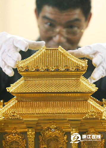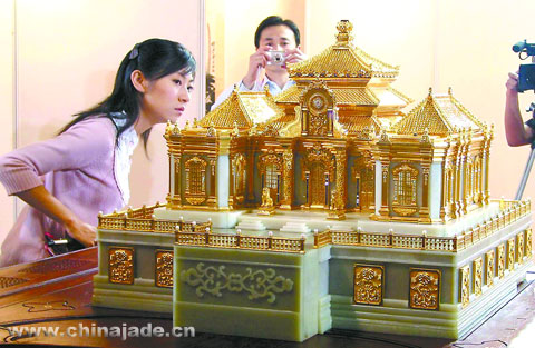 据介绍,"圆明园金玉大水法"制成于上世纪80年代,由80多位能工巧匠经5年多时间完成,它以1∶38的比例精致再现了圆明园内的重要建筑"大水法"。它的评估价值为2.33亿元人民币,堪称"国内第一标"。它实际耗用瑞士进口千足黄金60公斤,上乘珠宝翠钻4500粒,其中南非钻石约2500粒,斯里兰卡、缅甸、泰国产红蓝绿宝石1200粒,珍珠590粒,翡翠210块,"骨架"是从2.5吨重的新疆玉料中精选160公斤和田玉制成的,底座由已故国画大师关山月工作室设计制作